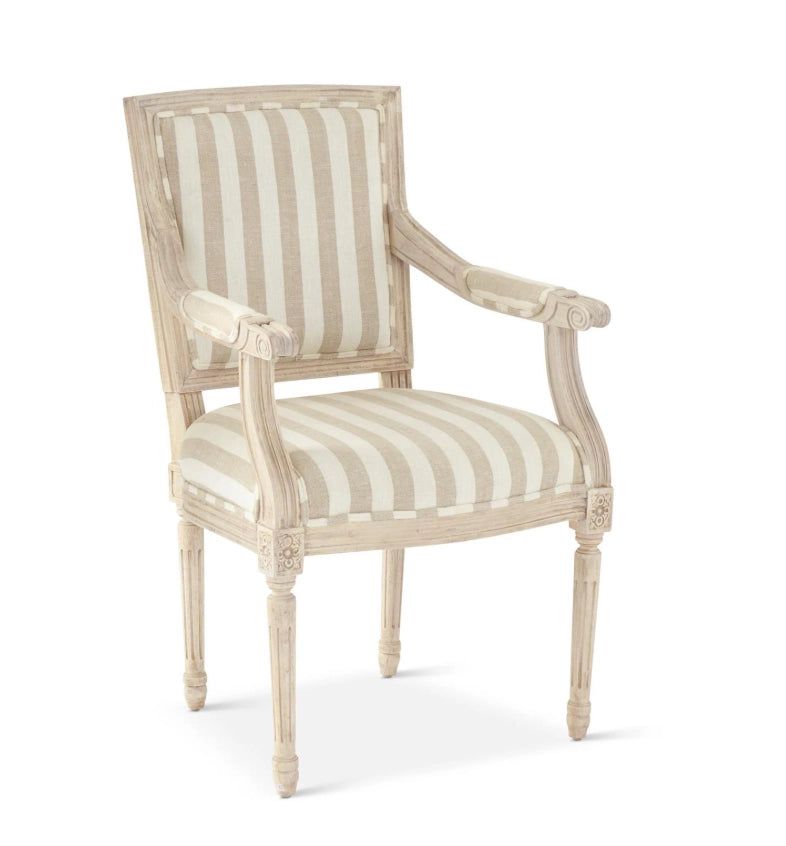This elegant, upholstered chair seamlessly transitions from dining room staple to statement accent piece. The whitewashed wood frame pairs beautifully with rich gray striping, creating a sophisticated aesthetic that commands attention in any space. Its refined silhouette and luxurious upholstery deliver timeless appeal, whether anchoring your dining table or elevating a living room corner with understated glamour.