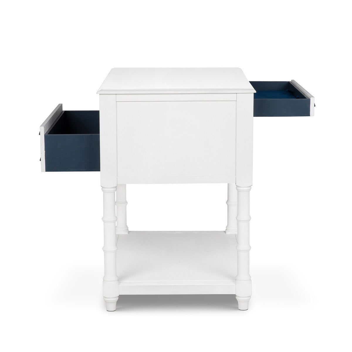 The Bimini Kitchen Island is an estate-inspired, Caribbean-influenced kitchen or occasional island, drawing on the Colonial Revival tradition of bamboo and faux bamboo furniture that emerged in the late 19th and early 20th centuries, especially in British Colonial and Anglo-Caribbean design. The piece brings the relaxed refinement of British Colonial estate style to today’s versatile living spaces. Its signature faux bamboo carved legs, a hallmark of the Bimini collection, lend an air of casual sophistication, while dual-access drawers with antique brass-finished hooded drawer pulls, removable Park Hill Collection Blue felt top drawer liners and an open lower shelf offer utility from every angle.