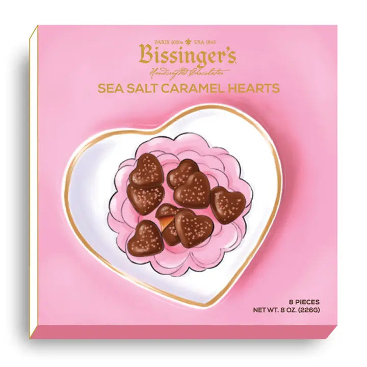 A LOVE-ly twist on the Bissinger's classic caramel! Each perfectly shaped heart is topped with Pink Himalayan salt. Each heart is enrobed in Bissinger's 38% milk chocolate. Bissinger's caramel recipe is over 300 years old and was once served at the Royal palace of Versailles in France!