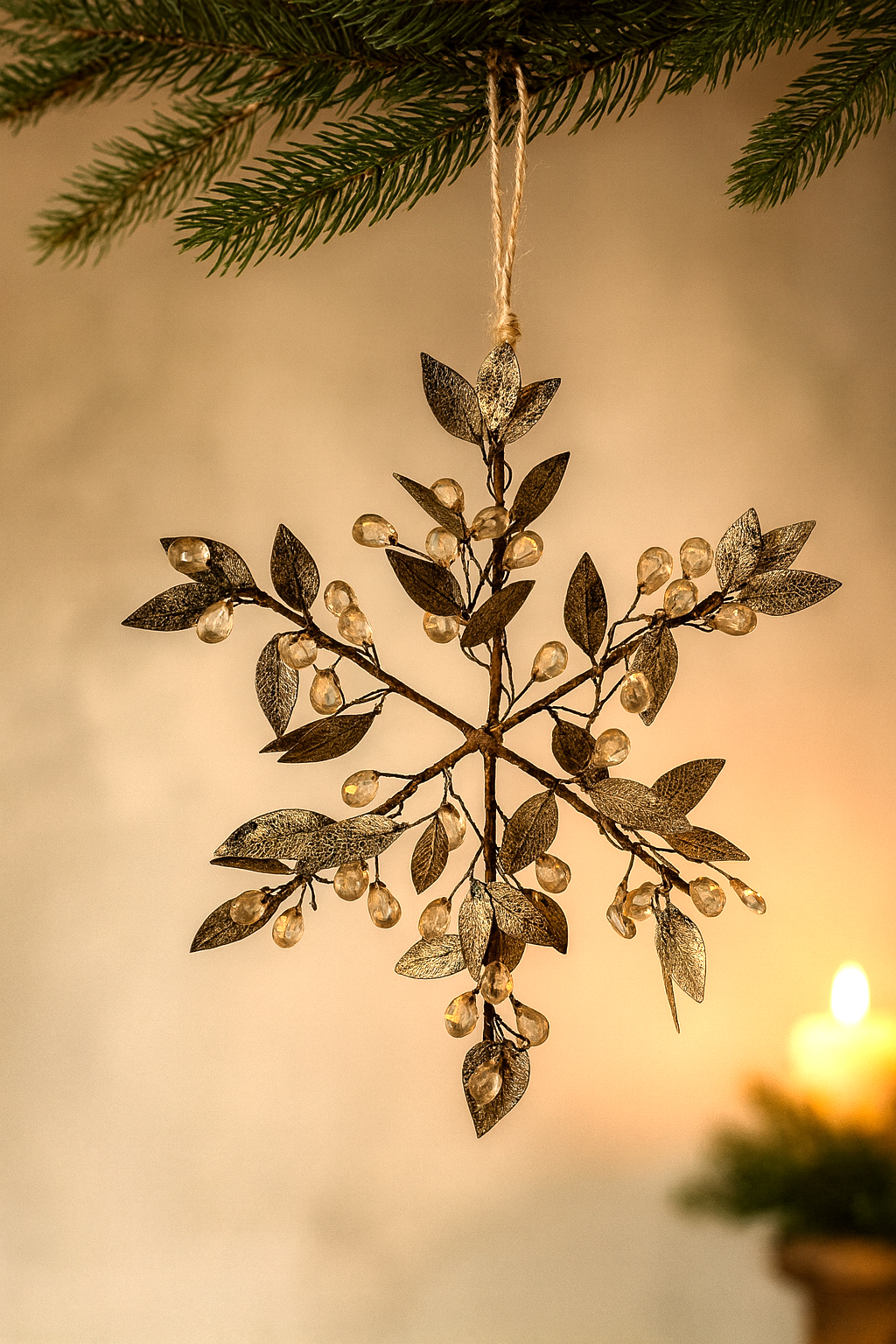 Add a touch of rustic elegance to your holiday décor with this stunning Jeweled Metal Snowflake Ornament. Crafted with intricate metal leaves and accented with crystal-like beads, this piece beautifully captures the sparkle of winter. Its antique finish and natural jute hanger bring a timeless, rustic charm—perfect for farmhouse, vintage, or cozy Christmas styles.