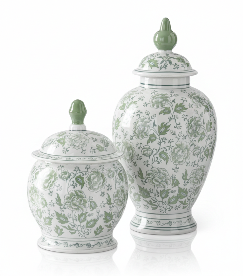 Green & White Floral Ceramic Ginger Jar - Choose Style