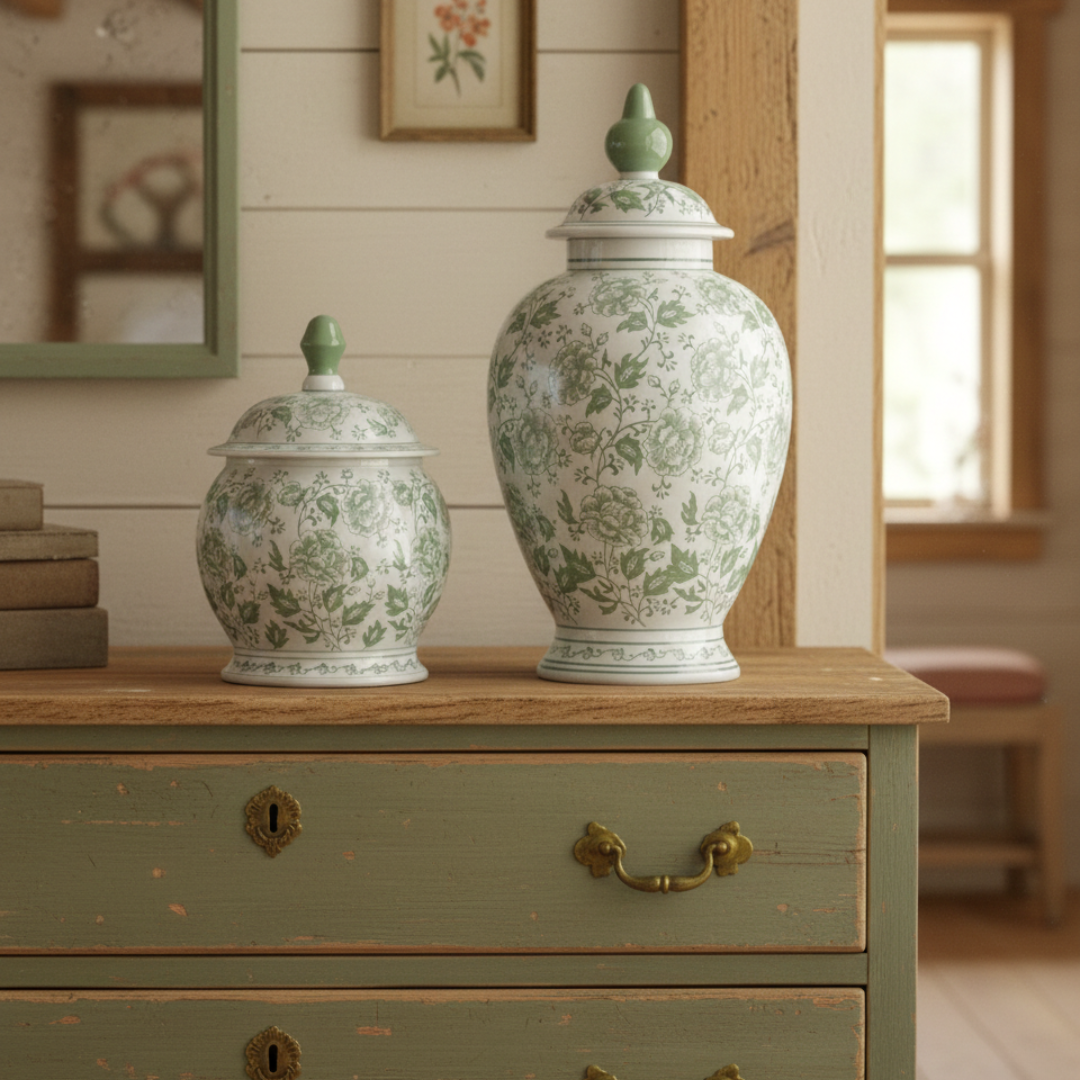 Elevate your décor with these stunning ceramic ginger jars in a captivating green hue that complements any season. Display them with lids for classic elegance, or remove the lids and fill with florals for an instant arrangement. Available in large and small sizes—mix and match to create layered, curated styling throughout your home. Versatile, beautiful, and endlessly adaptable.