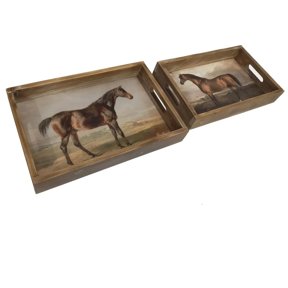 Elevate your home décor with this stunning set of two wooden trays, each showcasing an elegant equestrian design featuring a beautiful horse motif. Perfect for displaying on your coffee table or sofa table, these trays bring timeless sophistication to any living room. The classic aesthetic complements both traditional and contemporary interiors, while their practical design makes them ideal for serving, organizing, or simply adding a refined touch to your space. A versatile accent piece that combines beauty with everyday functionality.