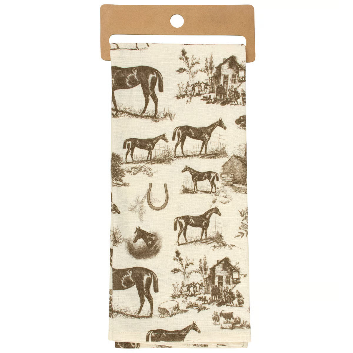 Bring timeless elegance to your kitchen with this charming Horse Toile Kitchen Towel. Featuring an all-over vintage-inspired horse illustration design, it combines classic aesthetics with everyday practicality. Machine-washable for hassle-free care, this durable towel is ready for daily use. Comes pre-packaged on a convenient cardboard hanger, making it perfect for display on your kitchen rack or as a thoughtful gift for equestrian enthusiasts.