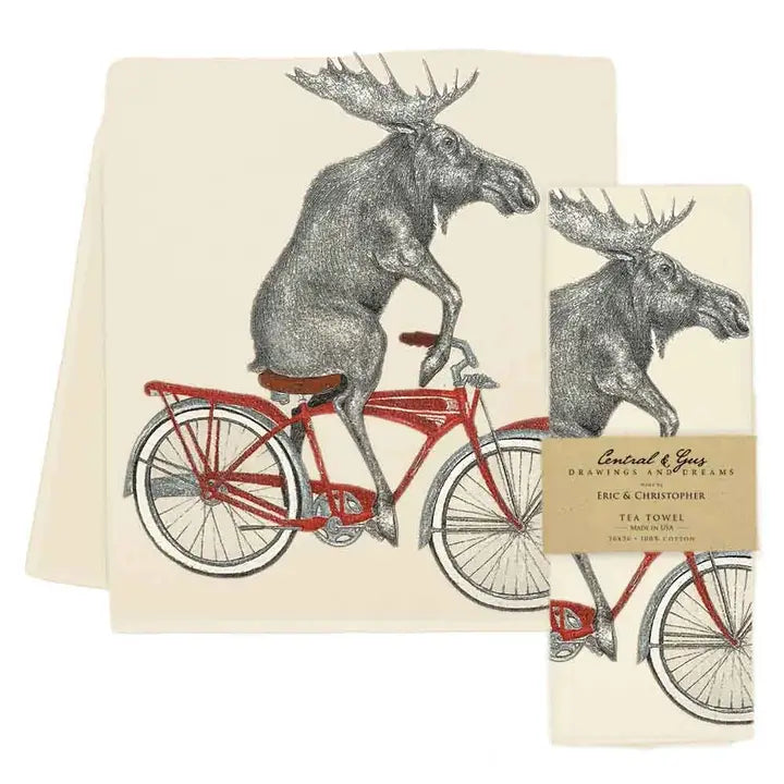 Bring whimsy to your kitchen with this delightful tea towel featuring a moose confidently riding a red bike. Perfect for adding personality and charm to your culinary space, this playful design makes a fun statement piece that sparks conversation. Ideal for drying dishes or displaying as a decorative accent, it's a lighthearted way to showcase your unique style and sense of humor.