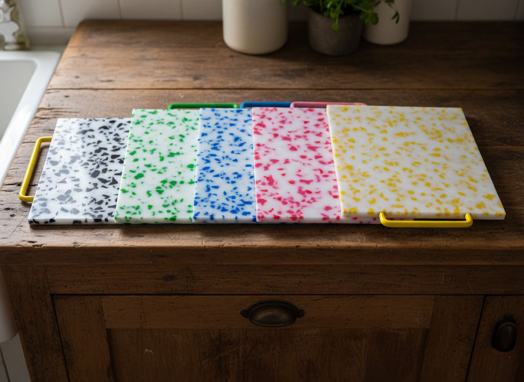 Professional Grade Food Prep Cutting Board is engineered for serious home cooks and culinary professionals; this cutting board combines durability with refined functionality. The generous 11" x 16" surface provides ample workspace for prepping vegetables, proteins, and garnishes, while the substantial 1" thickness ensures stability during use. Crafted from food-safe plastic that resists staining and odors, it maintains its appearance through countless meals. The powder-coated iron handle transforms everyday prep into effortless work, offering a secure grip and convenient portability between stations. Whether you're plating for guests or streamlining your kitchen workflow, this board delivers the performance and reliability that discerning cooks demand.
