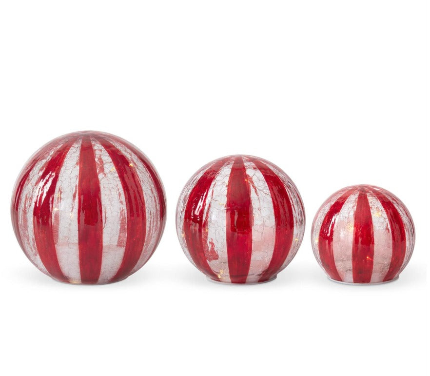 Brighten your holiday with the Red & White Striped LED Crackle Glass Tabletop Globe. Its radiant glass design resembles festive peppermint swirls, bringing warmth and charm to any room. Featuring a built-in timer, it offers hassle-free, timed illumination to keep your celebrations glowing effortlessly. Available in multiple sizes, this globe makes a striking centerpiece that transforms your space into a memorable seasonal display.