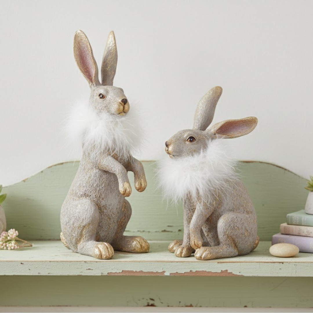 Adorable bunnies dressed in elegant feather collars bring springtime magic to any space. Choose between a charming standing pose or a sweet sitting position—or collect both for double the delight. Perfect for Easter displays, spring shelving, or festive seasonal décor, these whimsical companions add a touch of refined charm to your home. Taupe with gold accents create a sophisticated yet playful aesthetic that complements any style.