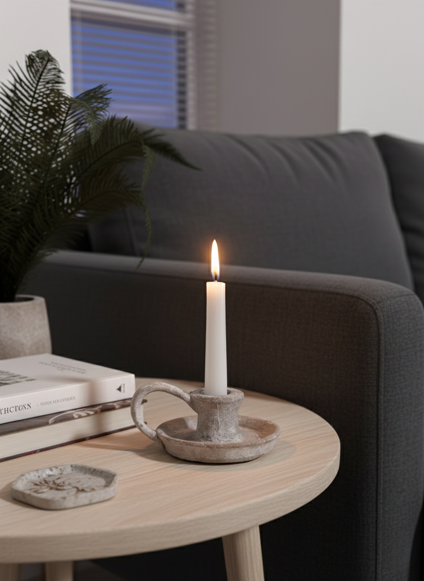 Whitewash Terracotta taper holder features a convenient handle. Perfect for displaying tapered candles while adding rustic charm to any room. The handcrafted appeal makes it an ideal accent piece for farmhouse, Mediterranean, or eclectic décor styles.