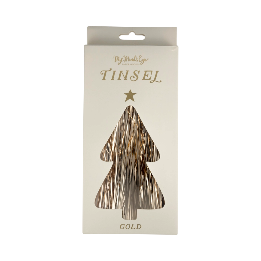 Add some sparkle and nostalgia to your holiday decor with our Gold Tinsel. This vintage-inspired tinsel will bring a touch of whimsy to your Christmas tree or home!
