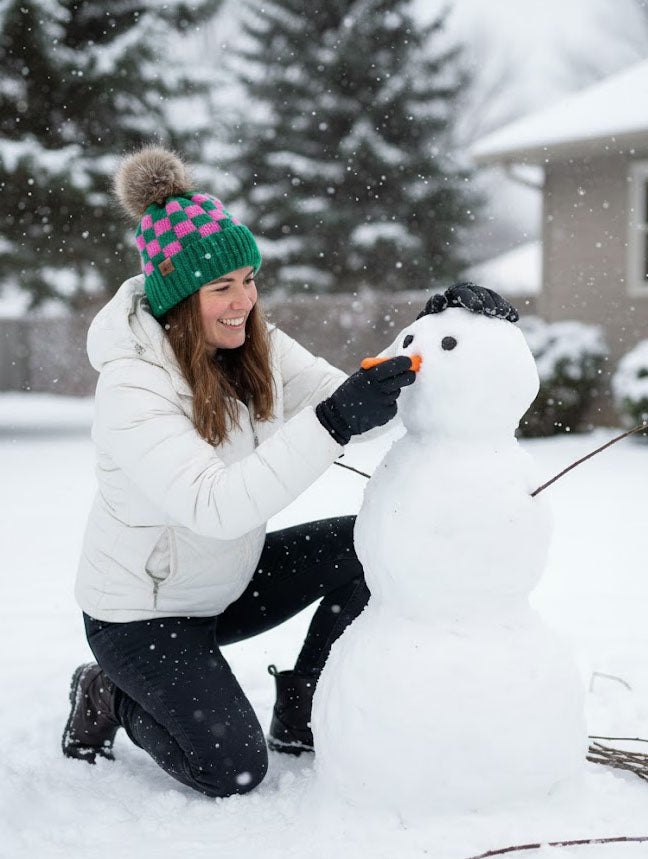 Stay cozy and cute with this charming knit pom pom hat featuring an adorable pink and green check pattern. The soft faux fur pom pom adds playful texture and dimension, making it the perfect accessory to elevate any winter look. Whether you're bundling up for chilly days or adding a pop of color to your outfit, this hat combines warmth with undeniable style. A must-have piece for anyone who loves quirky, eye-catching accessories.
