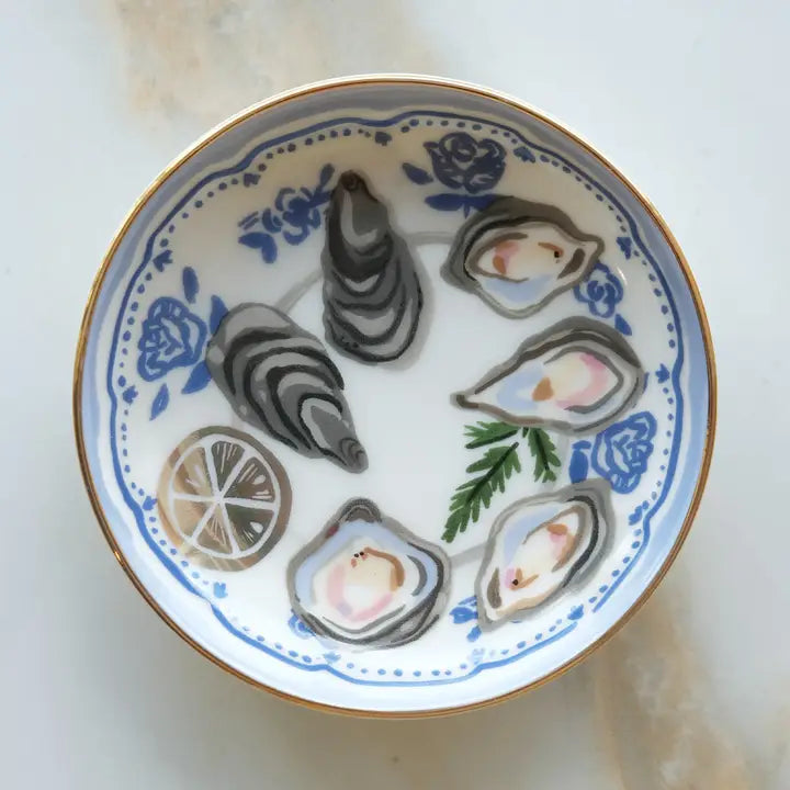 Ceramic trinket dishes are the perfect catchall for your nightstand or dresser. Our white porcelain piece features a stunning hand-painted fin oyster design, elevated with a delicate 10k gold-lined edge that catches the light beautifully. Whether you're organizing jewelry, keys, or small treasures, this functional art piece adds coastal charm to any room. Comes thoughtfully packaged in a plastic-free gift box—ready to give or keep for yourself.