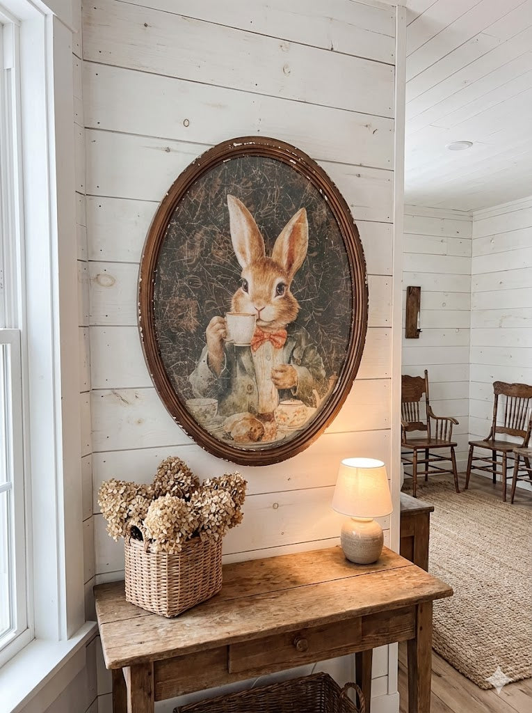 Charming bunny illustration captured in a beautifully weathered frame that whispers stories of timeless elegance. This delightful print features a whimsical bunny enjoying tea, bringing warmth and character to any space. The distressed frame finish creates an authentic vintage aesthetic—as if you've discovered a cherished treasure tucked away for decades. Perfect for refreshing your spring décor, adding personality to a nursery, or creating a focal point in a gallery wall. An enchanting piece that blends nostalgic charm with contemporary style, this framed print transforms ordinary walls into conversation starters.