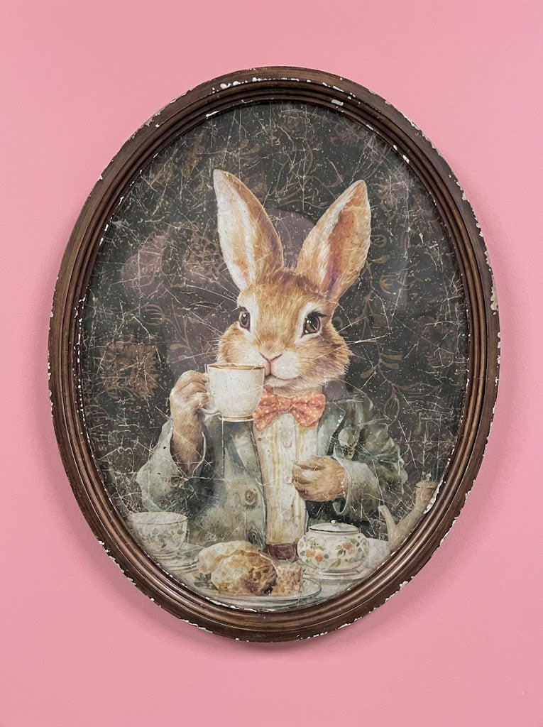 Oval Shaped Weathered Framed Bunny Sipping Tea