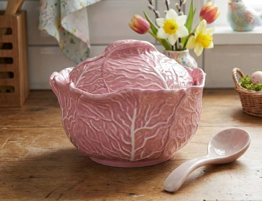 Bring effortless elegance to your spring entertaining with this charming pink cabbage tureen. The whimsical vegetable-shaped design adds playful sophistication to any table setting, while the generous 2.5-quart capacity makes it perfect for serving soups, stews, or sides. A conversation-starting piece that combines function with farmhouse charm.