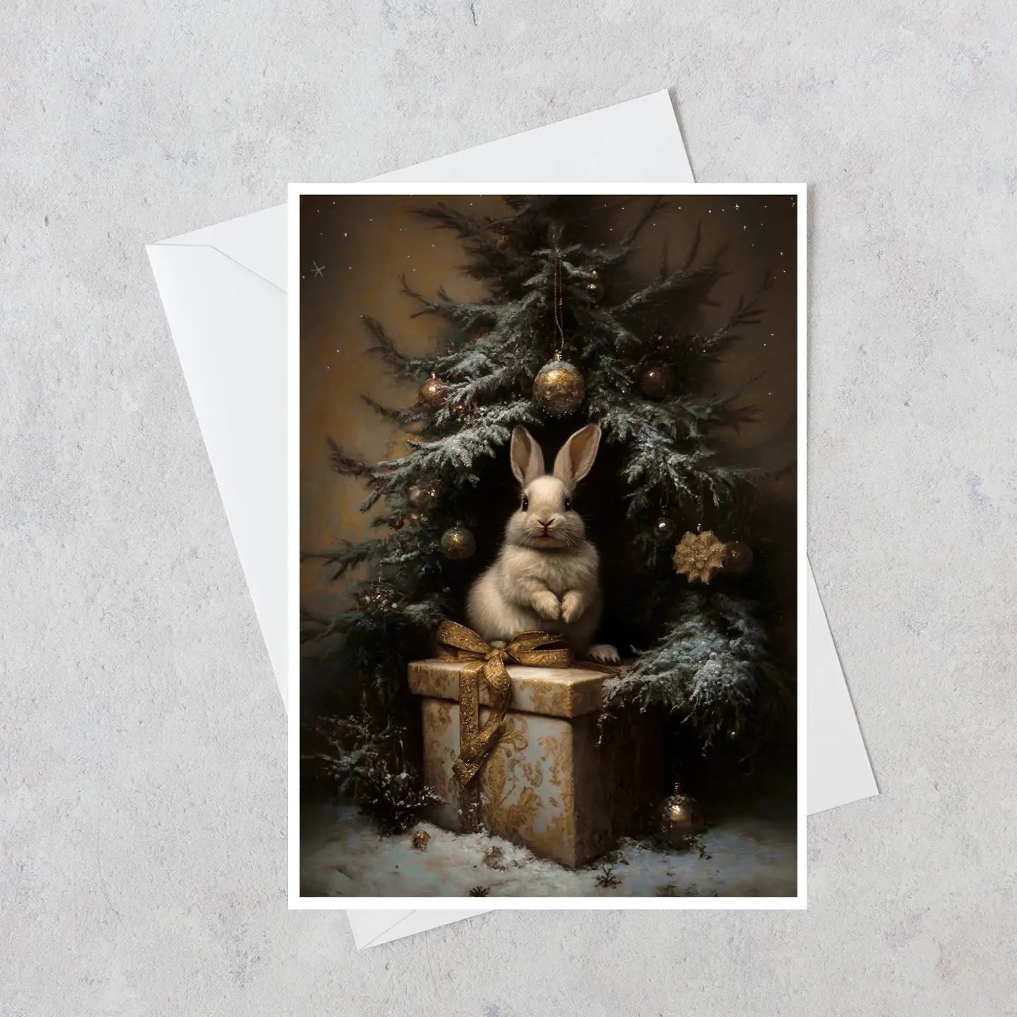 Celebrate the season with this playful holiday card featuring an adorable bunny nestled beneath a sparkling Christmas tree atop a beautifully wrapped gift. Its soft fur and wide eyes bring a touch of charm, perfect for spreading festive cheer to animal lovers and anyone who enjoys a sprinkle of holiday magic.