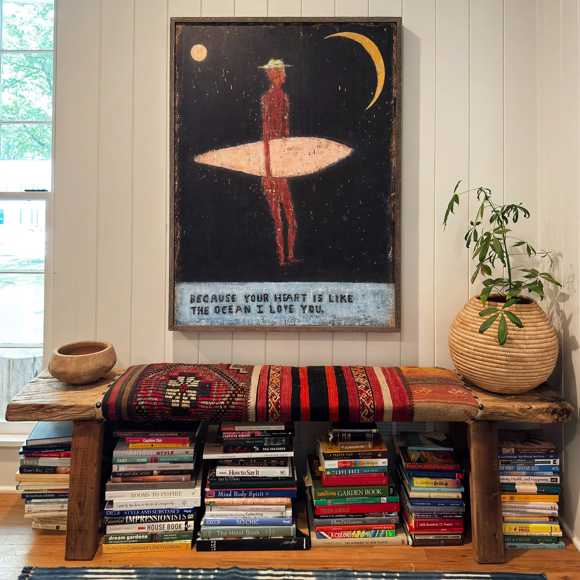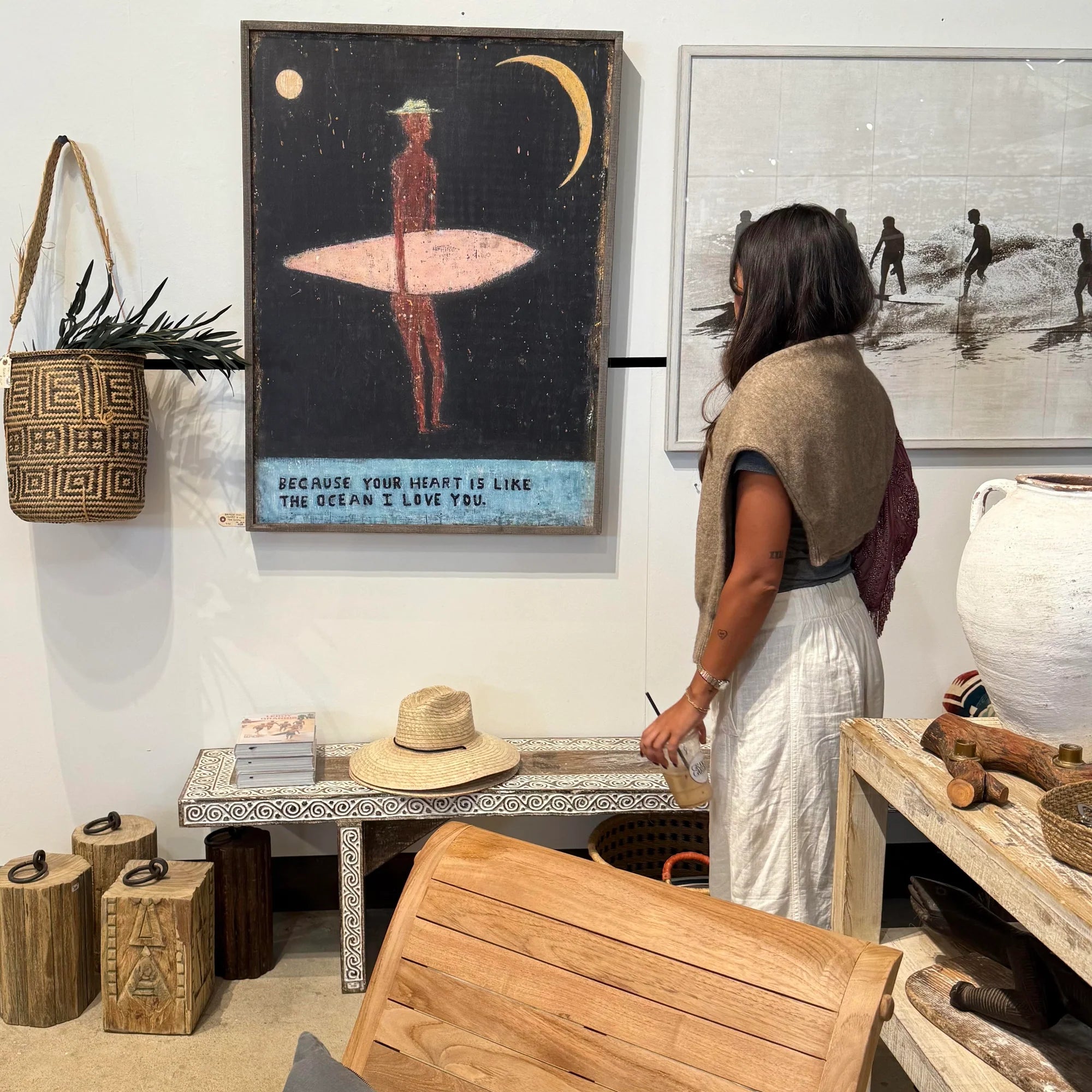 Dive into the dreamy and poetic world of the Because Your Heart Is Like The Ocean art print. Featuring a captivating silhouette of a surfer under the moon and stars, this piece speaks to the boundless depth and beauty of the heart. The textured, hand-crafted feel and whimsical charm of the print make it a striking statement for any room. Perfect for ocean lovers, free spirits, or anyone who feels a deep connection to love and nature, it’s a daily reminder of the vastness within us all. Frame it, gift it, or let it inspire your own creative tides.