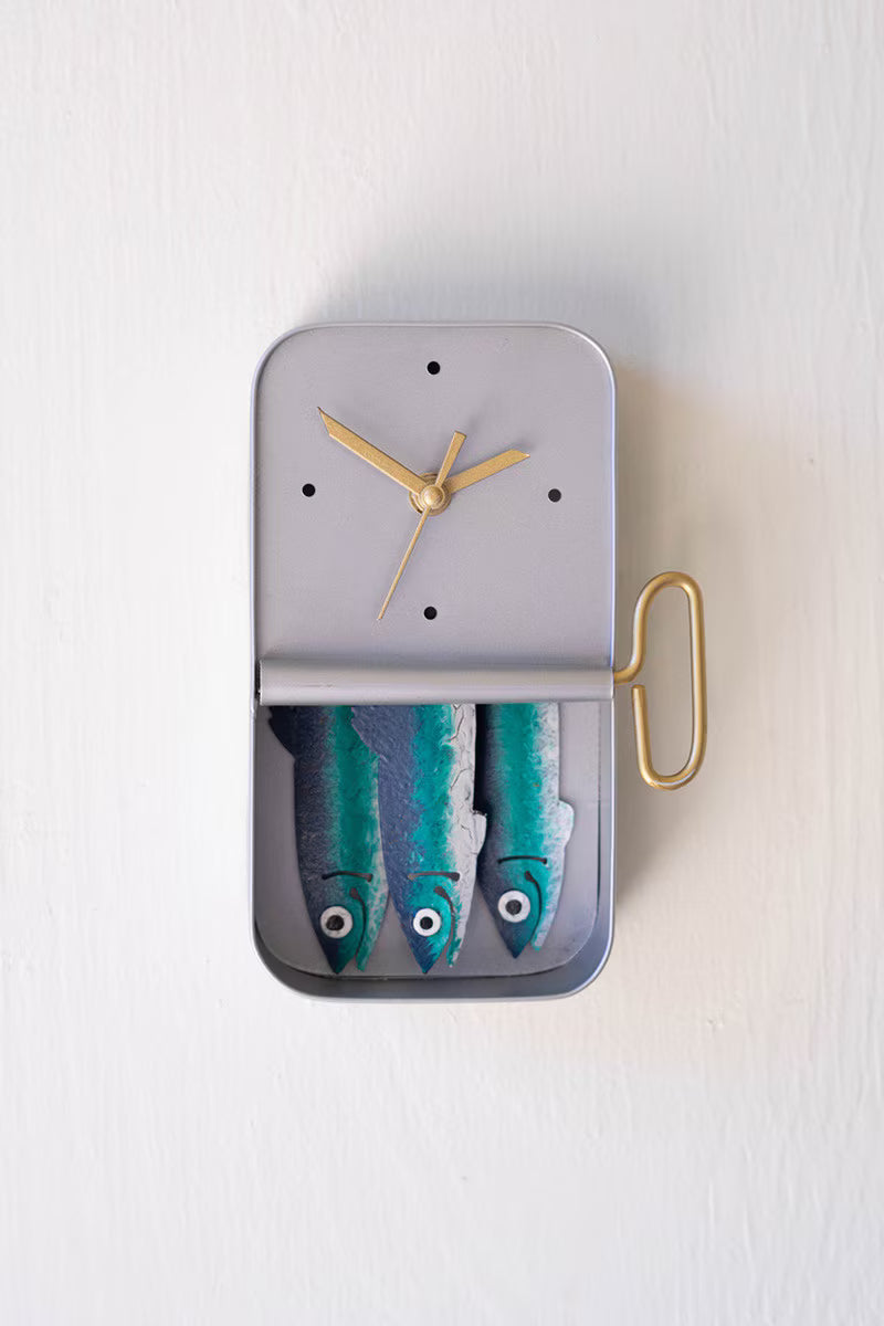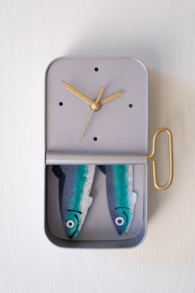 This sardine tin clock brings a splash of culinary, seaside whimsy to your wall. With its bright little fish and playful tin can design, it keeps time with a wink and a wave. A fun pick for kitchens or any space that could use a bit of nautical charm.