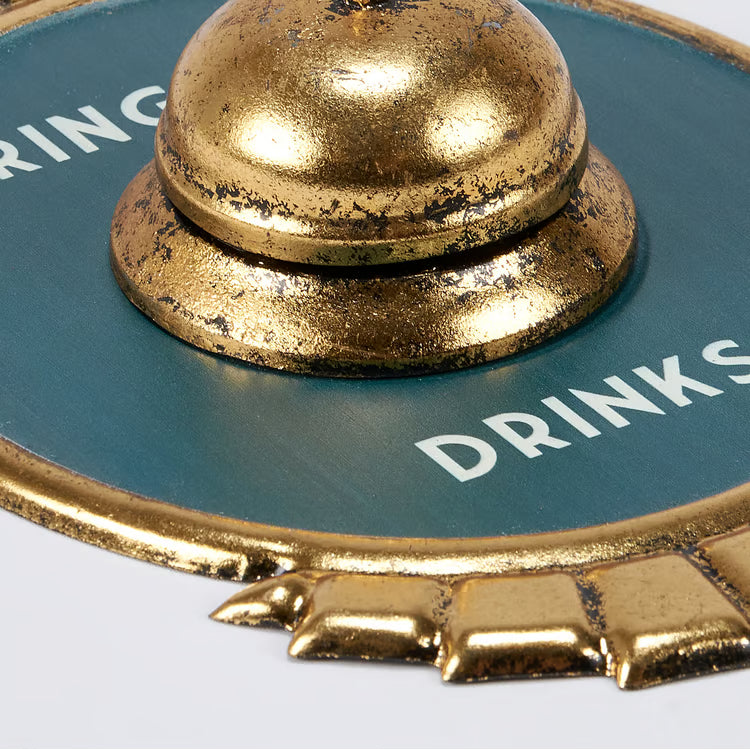 Displaying an art deco inspired design with a functional bell in the middle, this metal wall décor features the sentiment "Ring For Drinks" in bold lettering. Embossed details and metallic gold accents add vintage charm and sophistication to any space. The sign measures 7" x 11" x 2" and is crafted from durable metal construction. Pre-drilled holes at the top and bottom make installation effortless. Perfect for home bars, man caves, or anyone who appreciates vintage alcohol-themed décor with a playful twist. Ring the bell and let the good times begin.