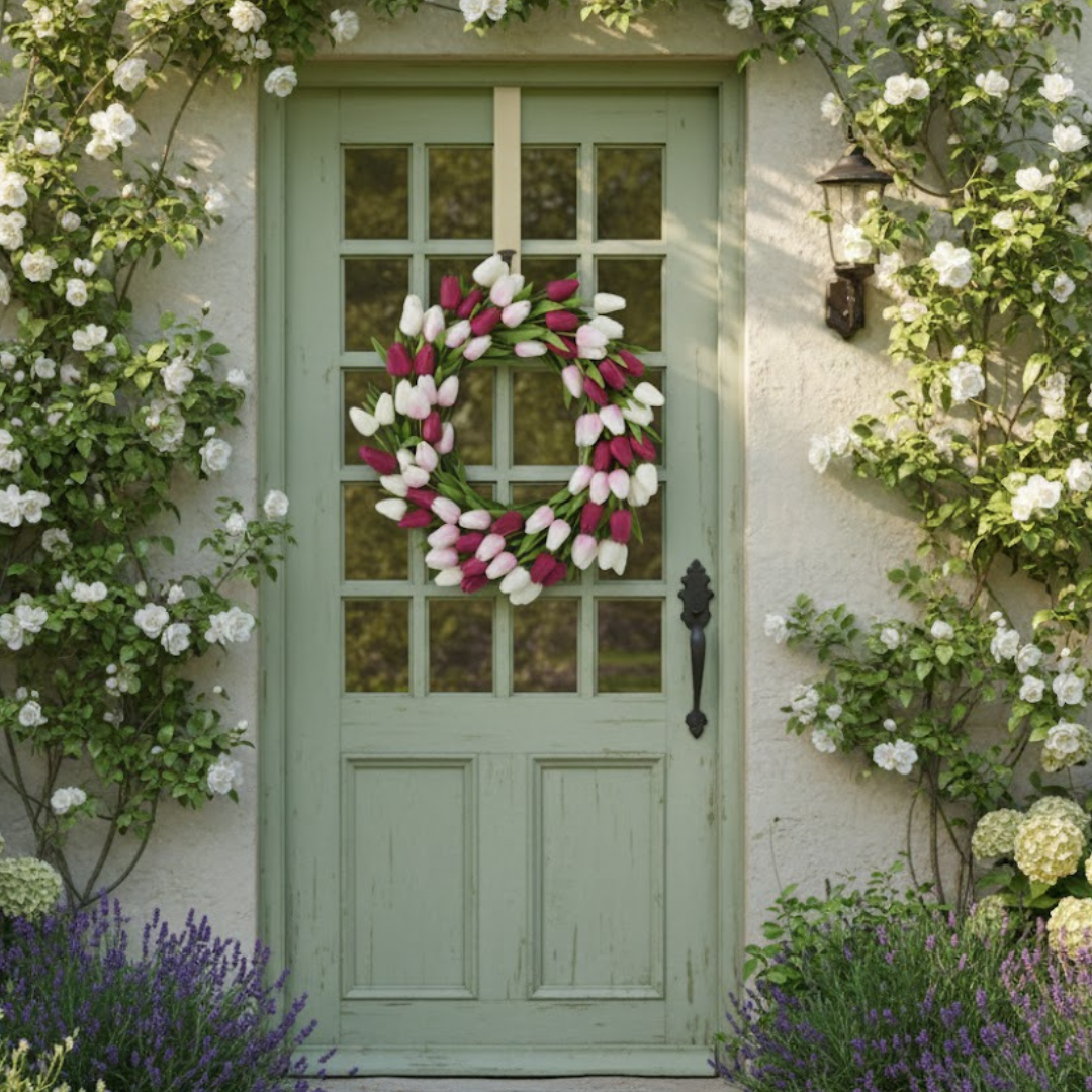 Bring spring indoors with this stunning 22" faux wreath featuring lifelike Fuchsia, Pink & White mini tulips. The vibrant hues instantly brighten any space, creating a cheerful focal point that welcomes the season. Crafted with Real Touch petals for authentic botanical appeal, this wreath delivers lasting beauty without wilting. Perfect for entryways, mantels, or accent walls—a timeless way to refresh your home décor.