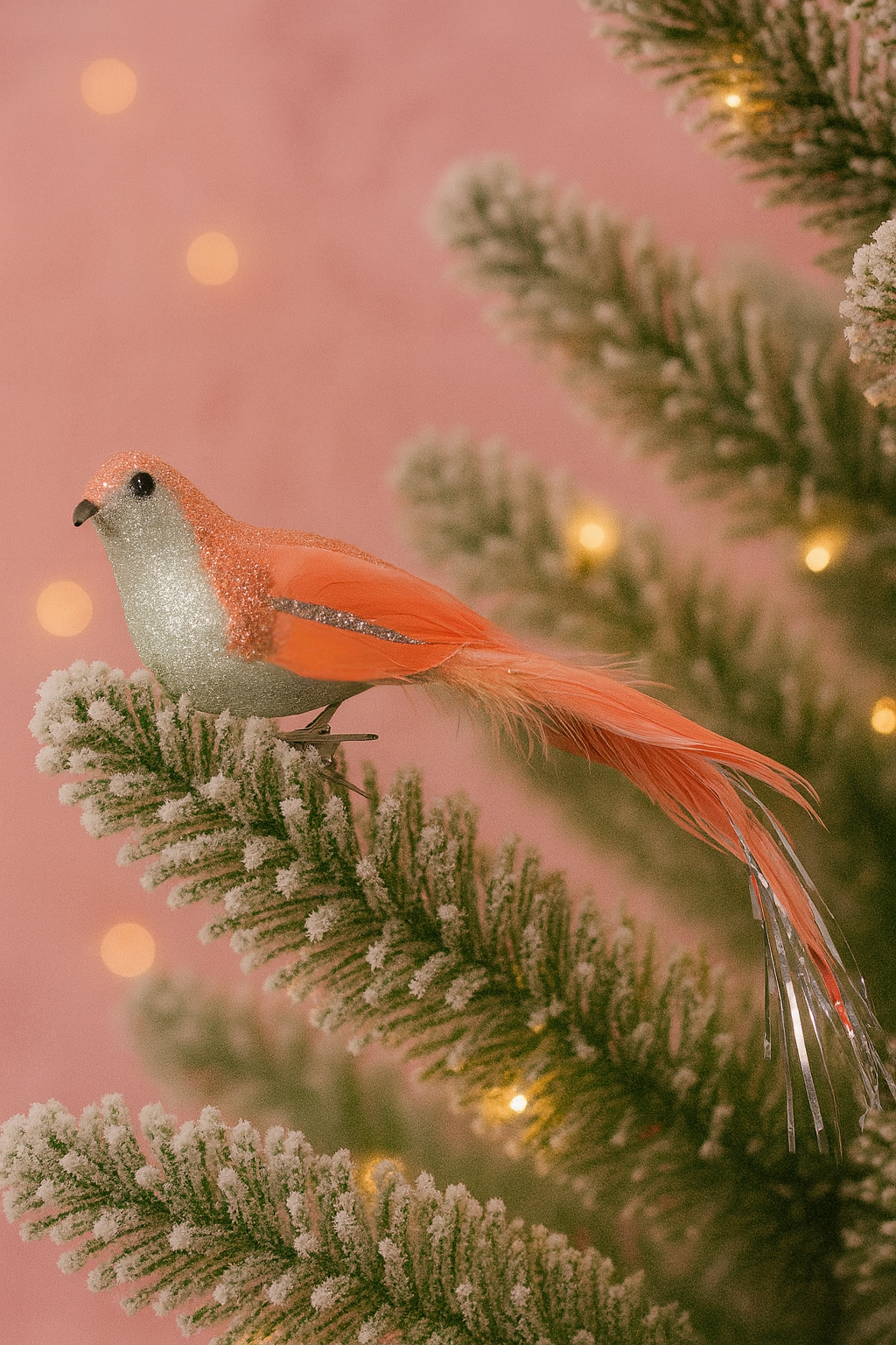 Bring a touch of whimsy and charm to your holiday décor with this Shimmering Pink Bird Clip Ornament. Featuring a shimmering glittered body, soft salmon-pink feathered wings, and a long flowing tail accented with silver tinsel, this little bird is ready to perch beautifully on your Christmas tree. The clip makes it easy to secure onto branches, garlands, or wreaths, adding instant elegance and a pop of playful color.